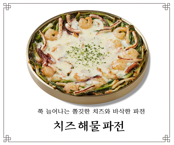 바삭한 해물파전에 모짜렐라 치즈를 듬뿍 넣어 고소함을 더했습니다.